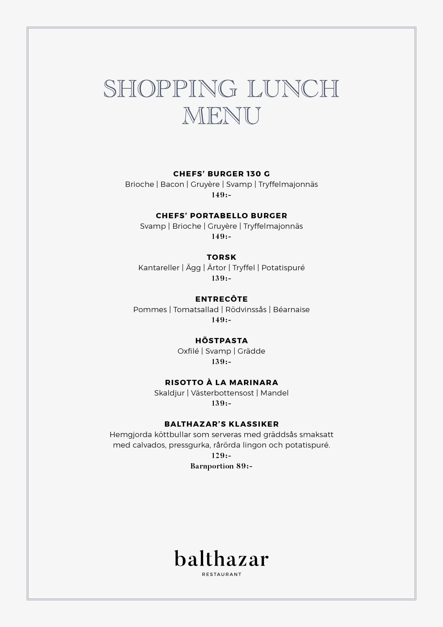 Shopping-lunch Shopping lunch 22-23 december Ute i sista minuten? Shoppa de sista klapparna innan julafton och njut av en specialkomponerad julmeny.